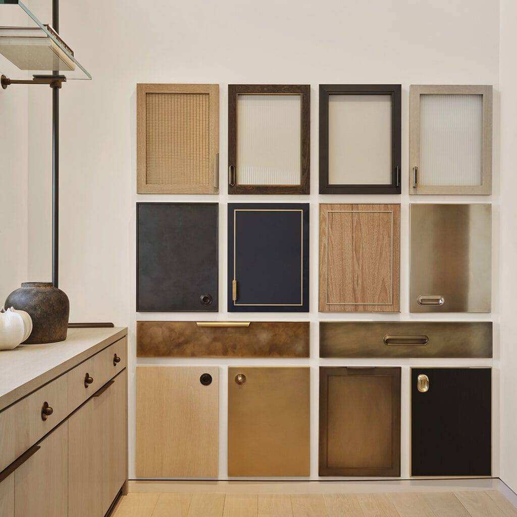 The view across Amuneal’s Los Angeles showroom featuring a range of kitchen and bar millwork as well as Amuneal’s Collector’s Shelving.