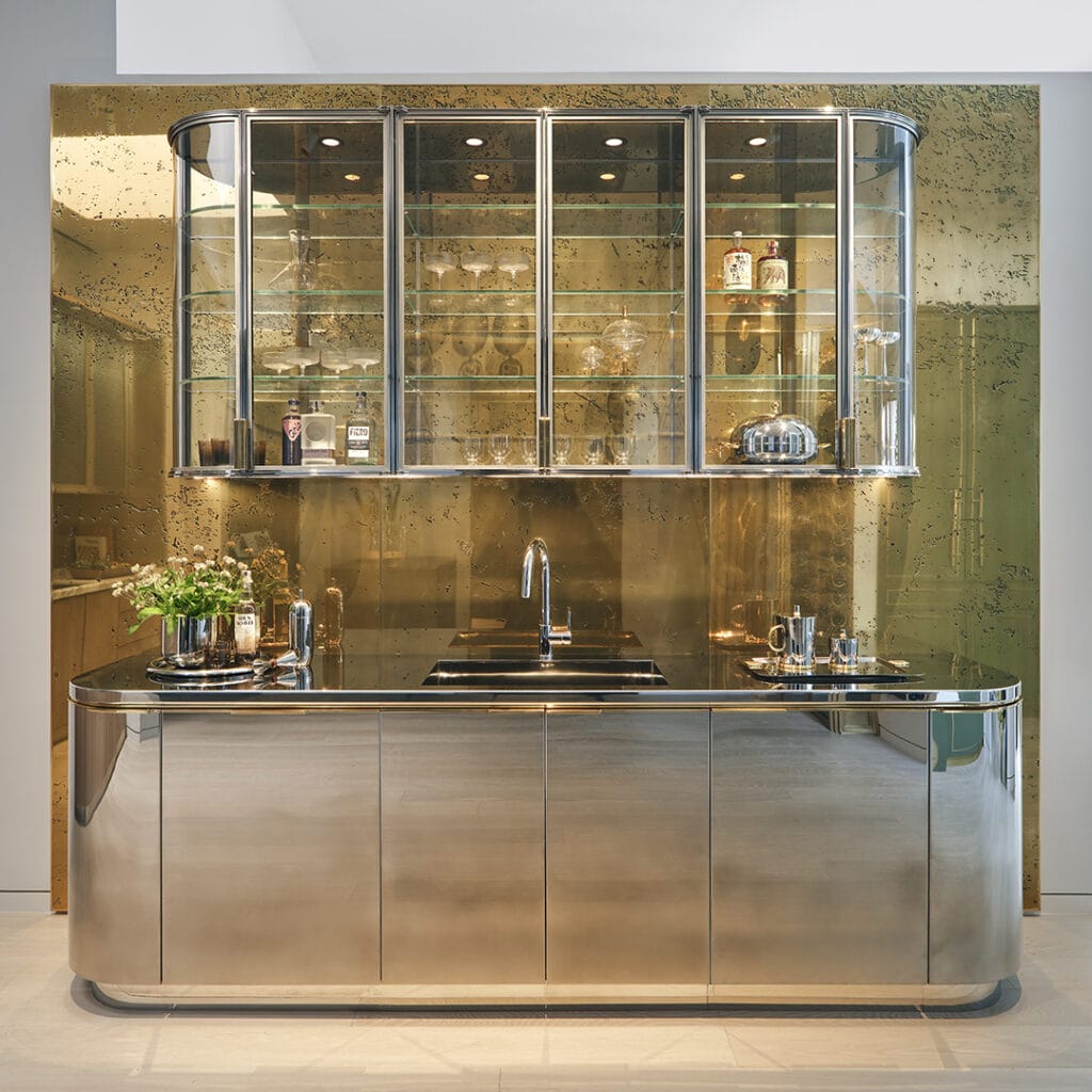 Amuneal’s mirror polished stainless steel kitchen with curved glass upper cabinetry and textured bronze backsplash.