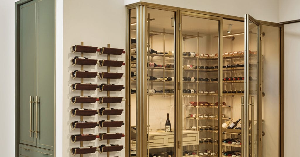 A walk-in, wine room, highlighting an expansive collection of over 350 bottles displayed on the brand’s award-winning Collector’s Shelving, enclosed by Amuneal’s Frankford Series Bronze Doors. Shown alongside Amuneal’s Bronze + Leather Wine Saddle Display and a Built-in Lacquer Bar.