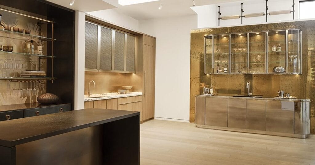 Throughout the showroom, curated vignettes highlight Amuneal’s craft—from a mirror-polished, stainless steel ombre bar with curved glass cabinets to a walk-in, wine room, highlighting an expansive collection of over 350 bottles displayed on the brand’s award-winning Collector’s Shelving. Additionally, an inspired display showcases Amuneal’s breadth of materials, finishes and hardware options for their kitchens, bars, and millwork.