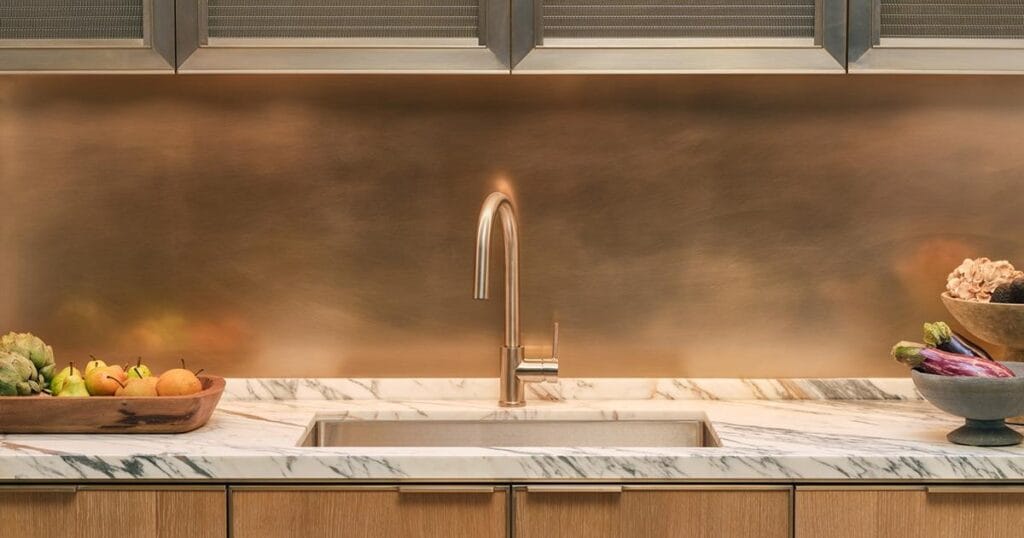 Another kitchen display with cerused white oak lower cabinetry, bronze Contour Pulls, honed marble countertop, burnished brass backsplash, and brass upper cabinetry with mesh infill.