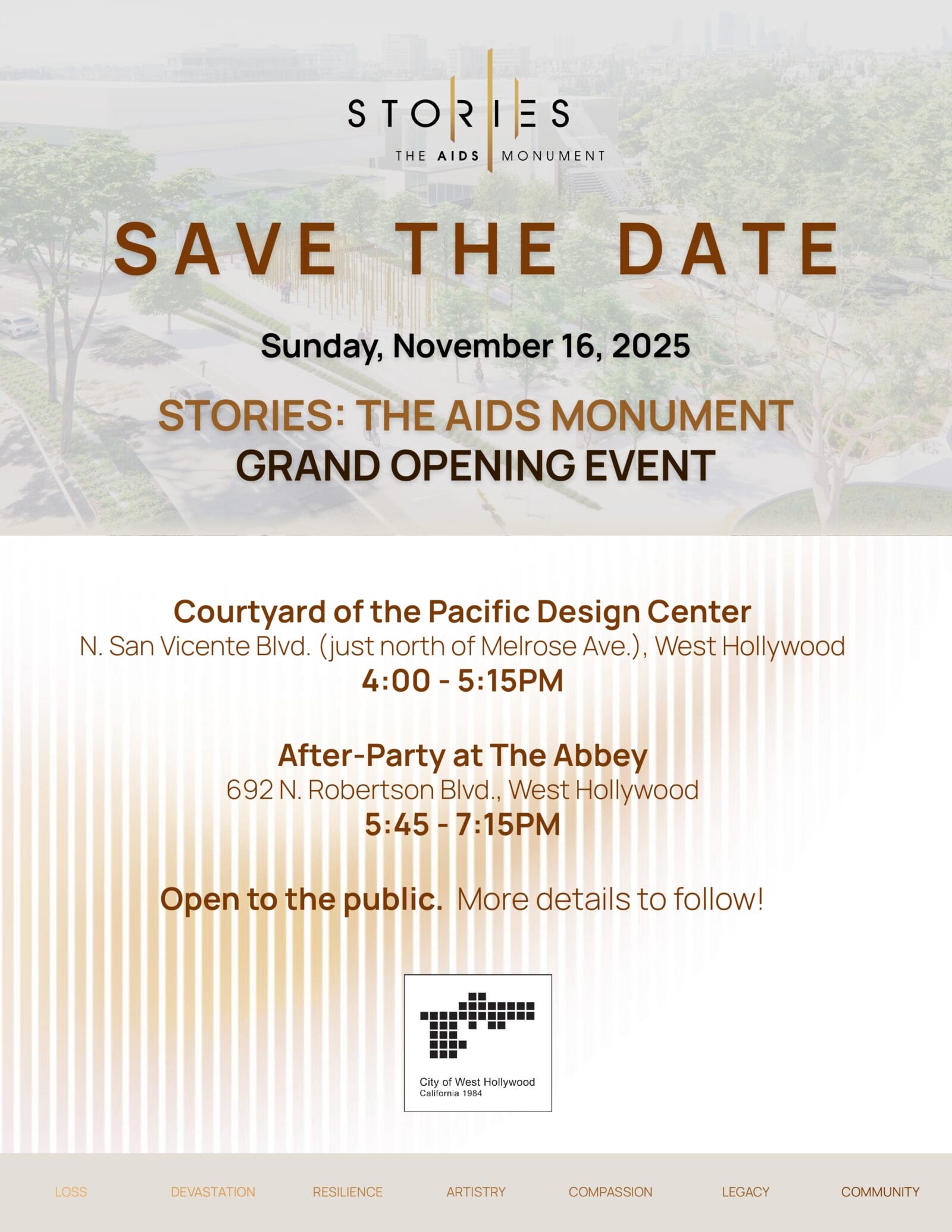 Join us in celebrating the long-awaited unveiling of STORIES: The AIDS Monument—a moving tribute to the resilience, artistry, and compassion that define our shared legacy. The event will honor the past, uplift the present, and inspire a future of remembrance and unity.