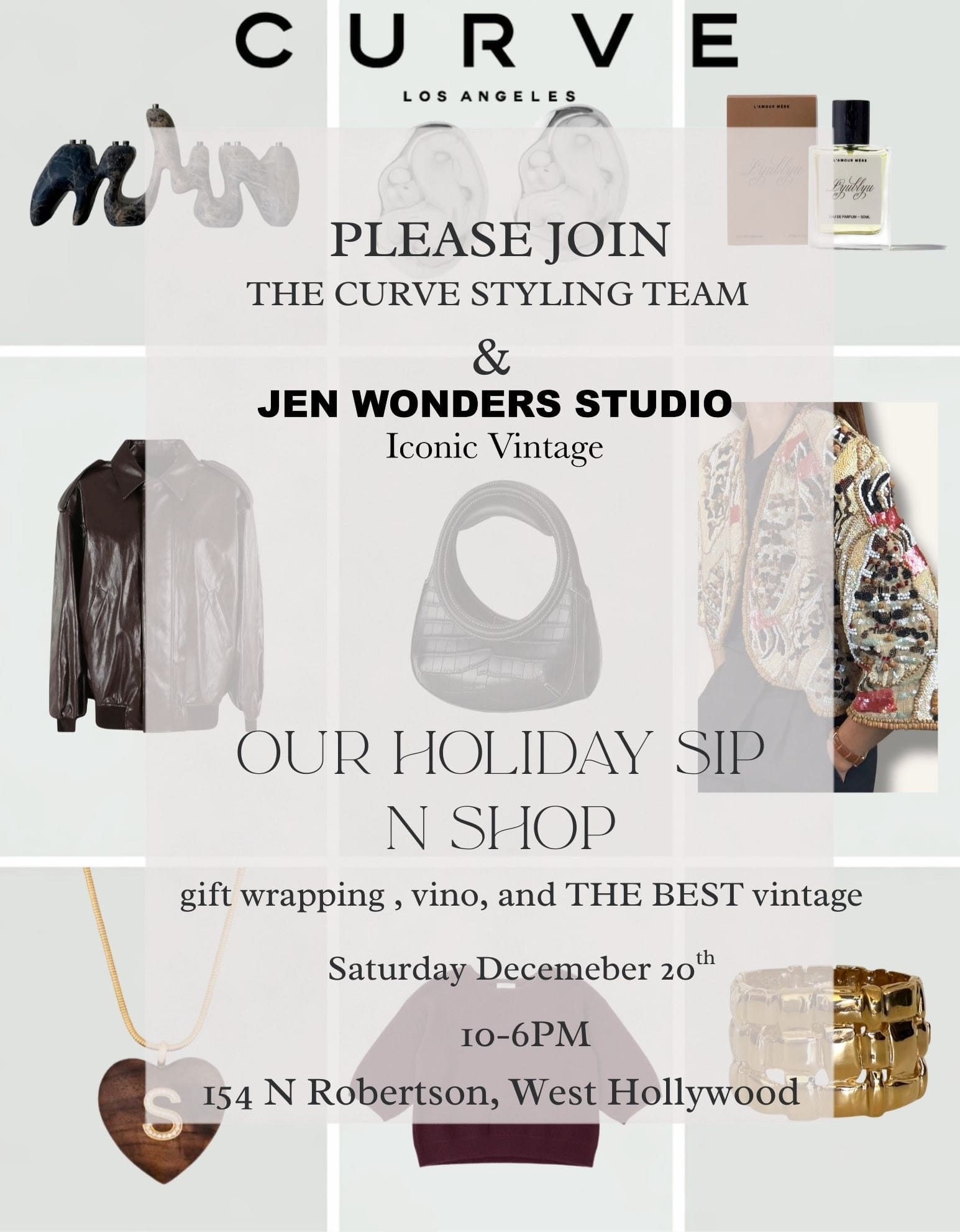 Join the Curve Styling Team and Jen Wonders Studio for a festive Sip N Shop celebration featuring gift wrapping, vino, and an exclusive edit of iconic vintage pieces.
