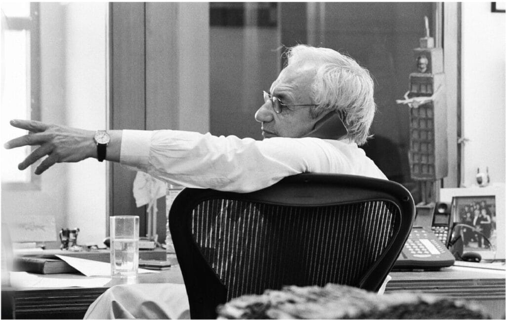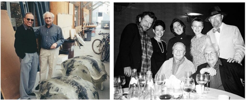 Gemini G.E.L., together with the Felsen and Grinstein families, join the many who are deeply saddened by the passing of Frank Gehry. For us, Frank was “family,” and our bond with him dates back decades. Beyond the visual impact Frank had on the city of Los Angeles, Frank had relationships deeply embedded within the Los Angeles art community, and he visited Gemini regularly, forming close friendships with many of the New York-based artists who were present collaborating in our workshops. In 1976, when Gemini decided to add a new building onto its property, Gehry was our first and only choice as the architect. Completed in 1979, it was one of Frank’s earliest commercial buildings in Los Angeles, with a gallery upstairs and printmaking studios on the ground floor. In fact, after graduating from architecture school, Gemini’s co- founder Elyse Grinstein worked for Frank and assisted in the design of our building. Frank’s buildings always seem to defy gravity, and, appropriately, during the early days of Covid, he added a wire “cloud” to span the space between our buildings, thereby creating an outdoor lunchtime dining area for our employees.