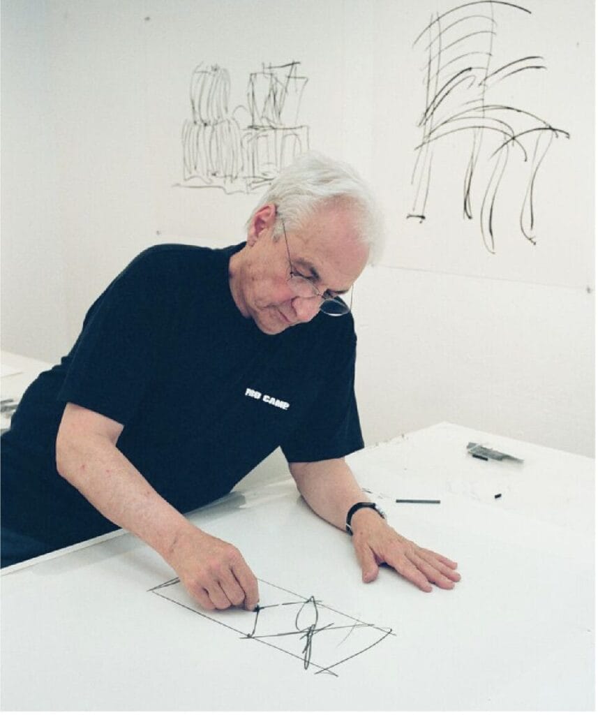 Among the most innovative architects in history, Frank’s designs have blurred the line between art and architecture, yet the aesthetic appeal of his sculpted creations never obscured the role of function. He always began each architectural project with a sketch, what he called the “tentativeness, the messiness.” From these drawings Frank refined his ideas until they finally were realized in tangible, three-dimensional form, and the dramatic nature of his buildings were a perfect inspiration for his elegant and gracefully energetic linear prints.